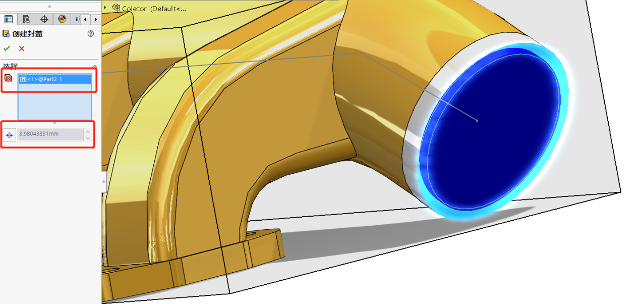 選擇好平面之后我們會(huì)發(fā)現(xiàn)下面同時(shí)可以參數(shù)化設(shè)定封蓋的厚度,而一般情況下我會(huì)建議大家盡量把厚度控制在1mm-2mm之間,這樣能減少因設(shè)置不存在的封蓋而產(chǎn)生的誤差。