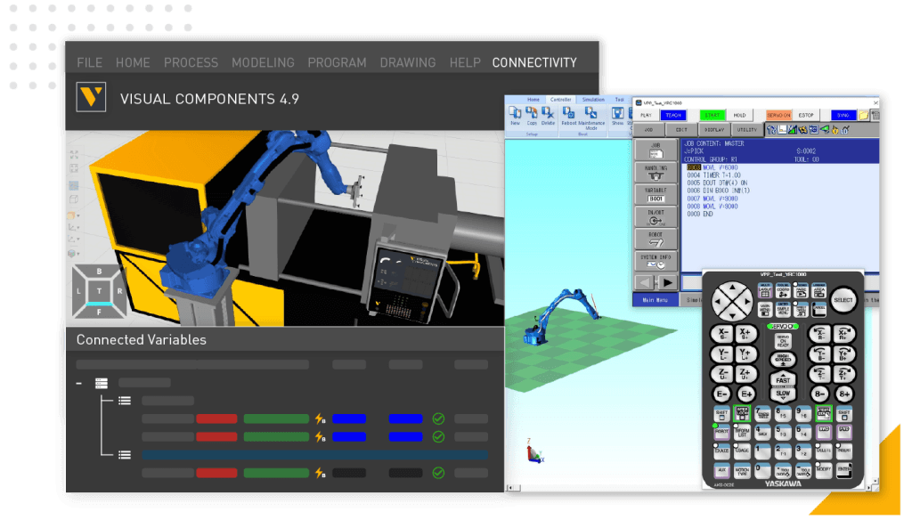 Visual Components 4.9 包含用于川崎和安川機器人的新連接插件,加快了機器人程序的測試和驗證。這種集成簡化了從模擬到實際應用的過渡,確保您的安川和川崎機器人系統(tǒng)能夠快速、正確地啟動和運行。